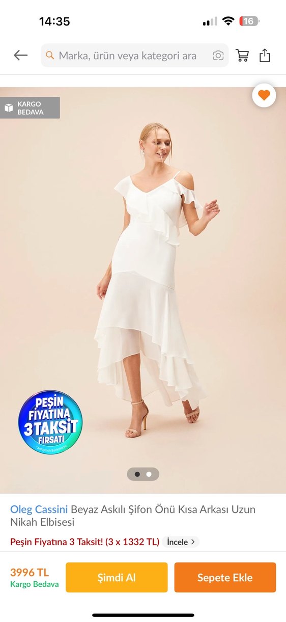 Beyaz, uzun, askılı şifon elbise, V yakalı ve fırfır detaylıdır. Düğünler için uygun, akışkan kesimlidir. ✨ Nikah, nikah sonrası yemeği, kız isteme organizasyonları için uygun. 1 gün nikah yemeğinde giyildi, temizletildi, yeni durumda. 36 beden etiketli ancak ben 38 beden olarak giydim, kesimi rahat.