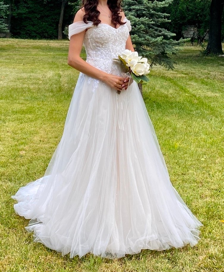 Oleg Cassini Armada şubesinden alınmıştır. Bir kere kullanıldı. Ürün straplez formdaydı kol kısımlarını şubede eklettirdim, dilerseniz tekrar straplez forma getirebilirsiniz. 1.68 boyundayım, 10-12 cm platform topuklu için gelinliğin boyu ayarlandı. Kuru temizlemeye götürdüm ancak memnun kalmadım. Siz güvendiğiniz bir kuru temizlemeciye götürerek arka kuyruğundaki lekeleri çıkarttırabilirsiniz. Gelinliğin tüllerine ütü gerekiyor. Ayrıca sağ arka alt tülünde 3-4 cm lik bir sökük var. Başka herhangi bir defosu, yırtığı vs yok. Etiketinde marka ismi Viola Chan yazıyor, tülünün markası ise Macharel.