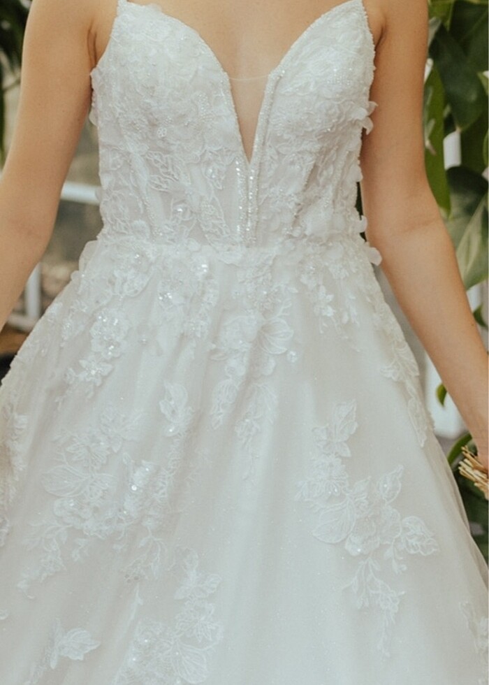 Dugunde ve cekimde iki defa giyildi. Oleg Cassini Viola Chan modeli. 1.63 cm boyunda, 50,5 kilo iken giydim. 34 Beden yarim cup gogus. Yarim kabarik tarlatan ile birlikte satiyorum.