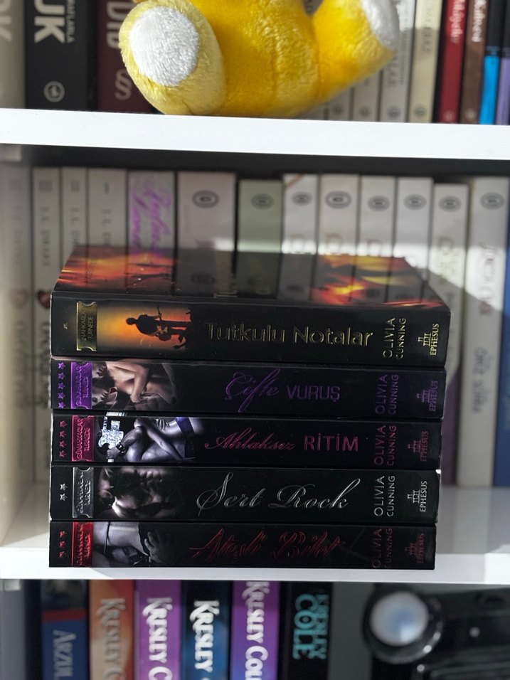 Olivia Cunning'in beş romanından oluşan set. "Tutkulu Notalar" ve "Vuruluş" gibi başlıklar içerir. Karanlık ve sanatsal kapaklara sahip kitaplar raf üzerinde düzenli.