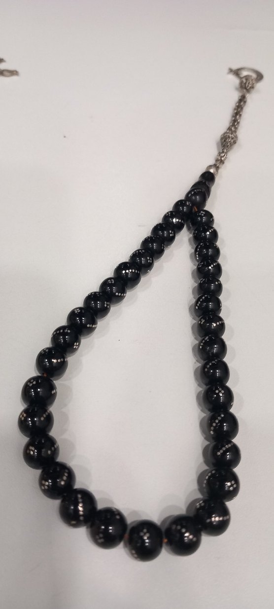 Gümüş işlemeli Oltu tesbih Siyah, parlak yuvarlak boncuklardan oluşan minimalist tasarımlı erkek tesbihi, gotik stile uygun.