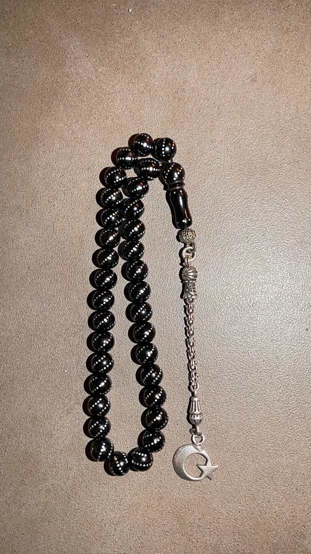 Ay ve yıldız figürlü, parlak siyah gotik tarzı erkek tesbih. Koyu ve şık bir görünüme sahip. 925 ayar gümüş püsküllü. Tertemiz bir Oltu