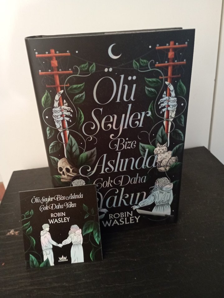 Robin Wasley'nin "Ölü Şeyler Bize Aslında Çok Daha Yakın" adlı kitabı, gizem ve doğaüstü temalarını iskelet eller ve doğa unsurlarıyla süslenmiş karanlık kapak tasarımıyla sunuyor.