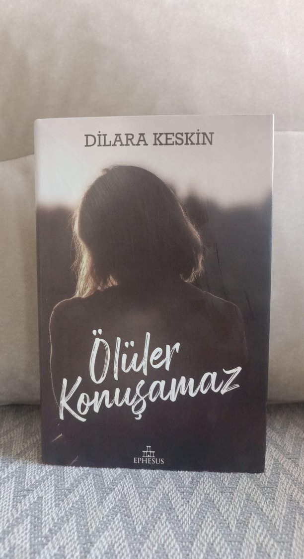 Dilara Keskin'in "Ölüler Konuşamaz" adlı romanı, derin ve düşündürücü temalar içeriyor. Kapakta bir siluet yer alıyor. afiş ve ayrac mevcut