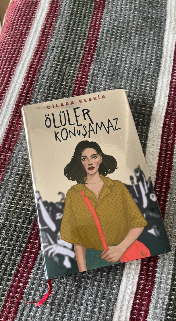 Dilara Keskin'in "Ölüler Konuşamaz" romanı, dikkat çekici kapak tasarımıyla koyu saçlı bir kadını ve arka plandaki kalabalığı gösteriyor.