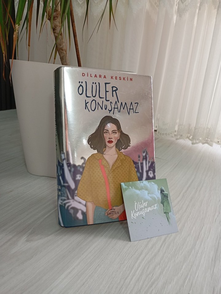 Dilara Keskin'in "Ölüler Konuşamaz" adlı romanı, sarı kıyafetli bir kadının çizimli kapak tasarımına sahip. Okunmaya değer bir eser , görseldeki ayraç hediye.