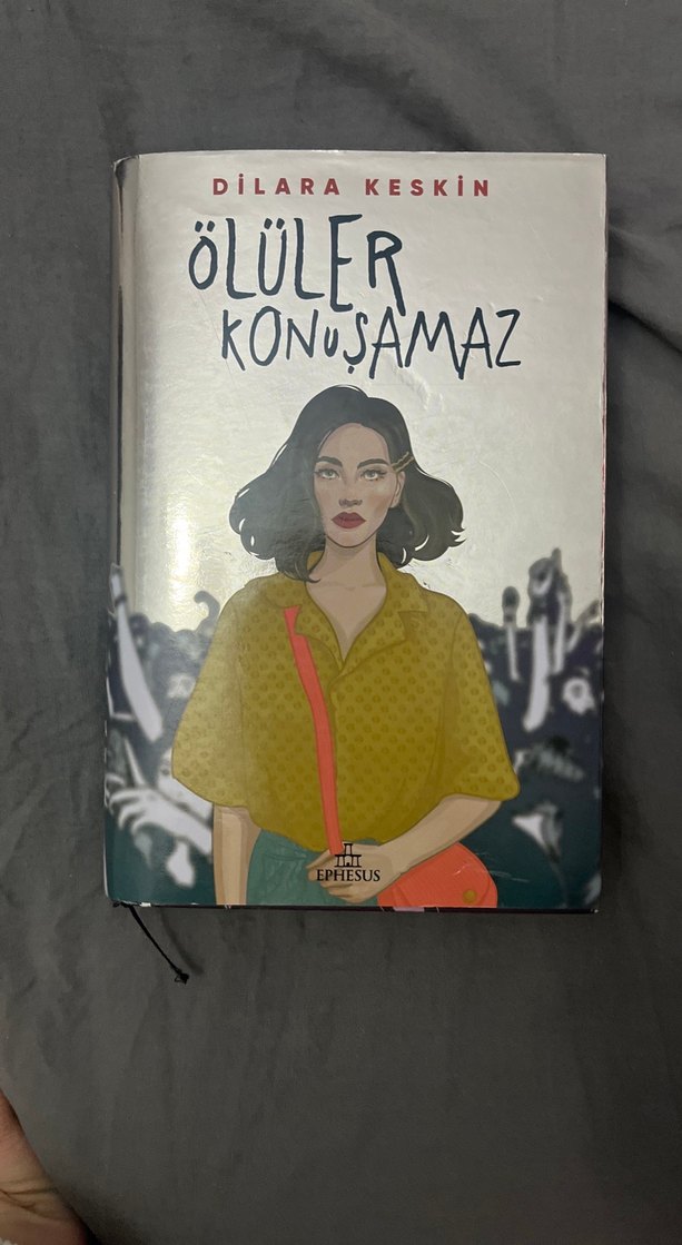 Dilara Keskin'in Ölüler Konuşamaz romanı, sarı bluzlu ve kırmızı çantalı bir kadını ve kalabalık bir arka planı konu alır.
