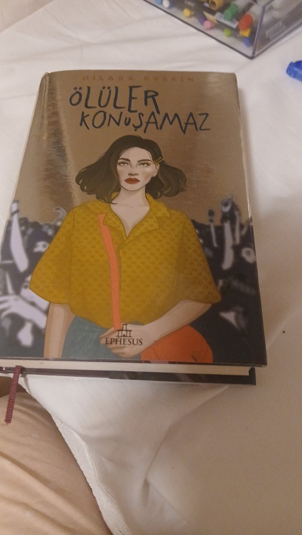 İlhan Keskin'in 'Ölüler Konuşamaz' adlı romanı, sarı gömlekli bir kadının illüstrasyonuyla kaplanmıştır. Ephesus yayınevinden.