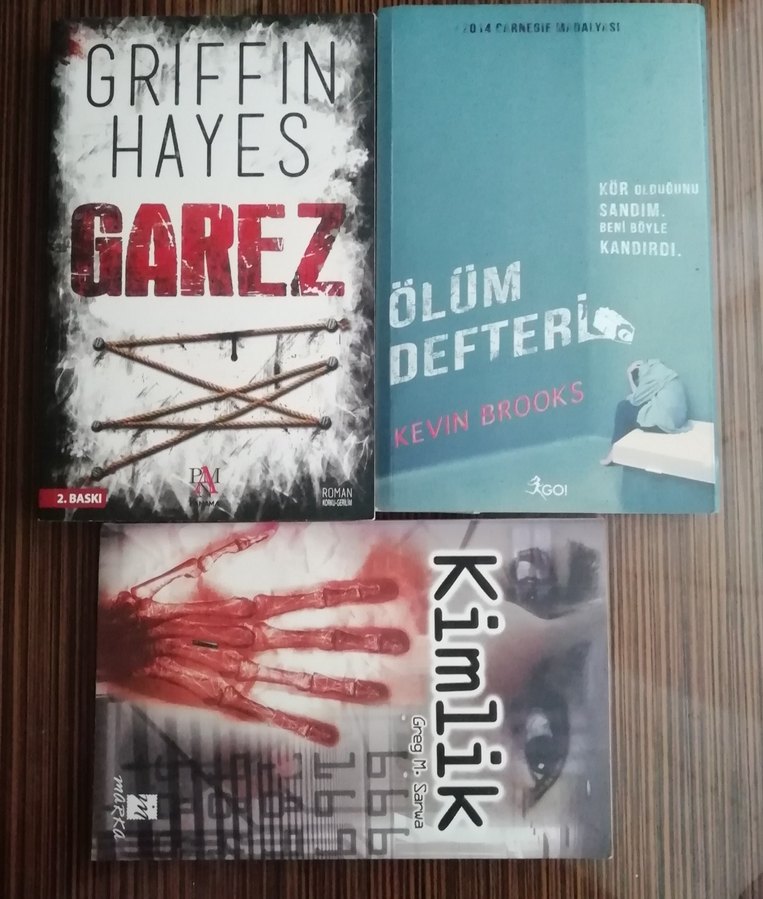 Griffin Hayes'in 'Garez', Kevin Brooks'un 'Ölüm Defteri' ve Greg m. sarwa'in 'Kimlik' kitaplarından oluşan üçlü roman seti. eski kitaplar olduğu için sararmışlardır yer yer sarı benekler de olabilir ama asla okuma zevkini etkileyecek büyüklükte değiller, onun harici temiz kitaplar.