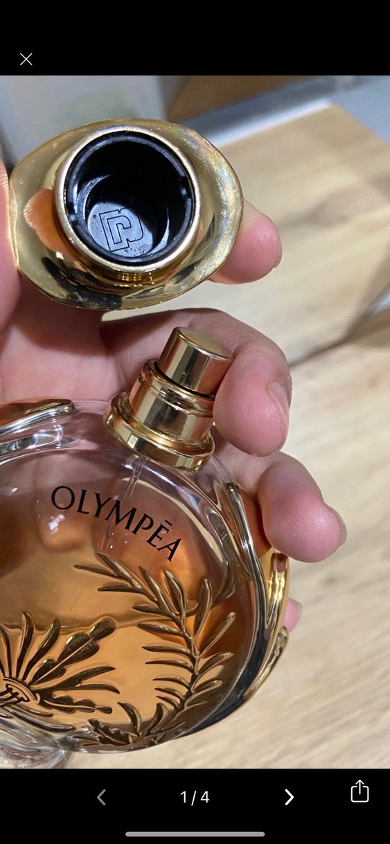 Altın detaylı şık cam şişede Olympea kadın parfümü. Zarif ve sofistike bir kokuya sahiptir.