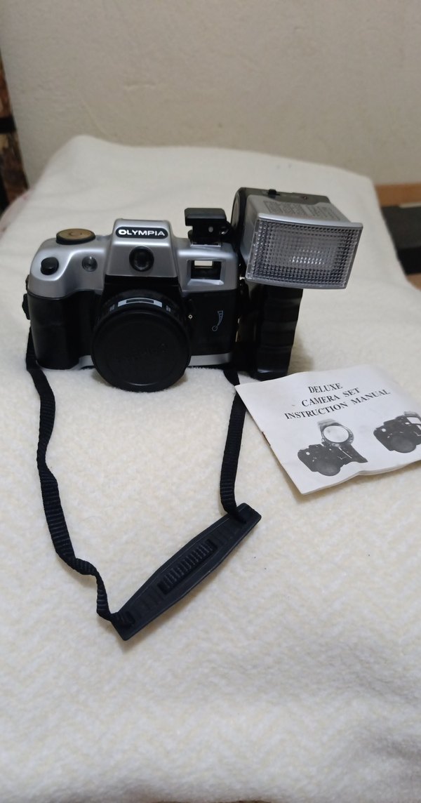 Olympia gri renkli filmli fotoğraf makinesi, çıkarılabilir flaş ve askı ile birlikte. Kullanım için talimat kılavuzu da mevcuttur.