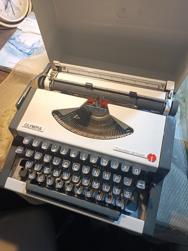 Gri tuşlara sahip beyaz Olympia Traveller de Luxe daktilo. Gövdesinde "OLYMPIA, IF" yazısı bulunur. ️ Temiz calismakta , yazı aerisi değişmeli silik yazmakta