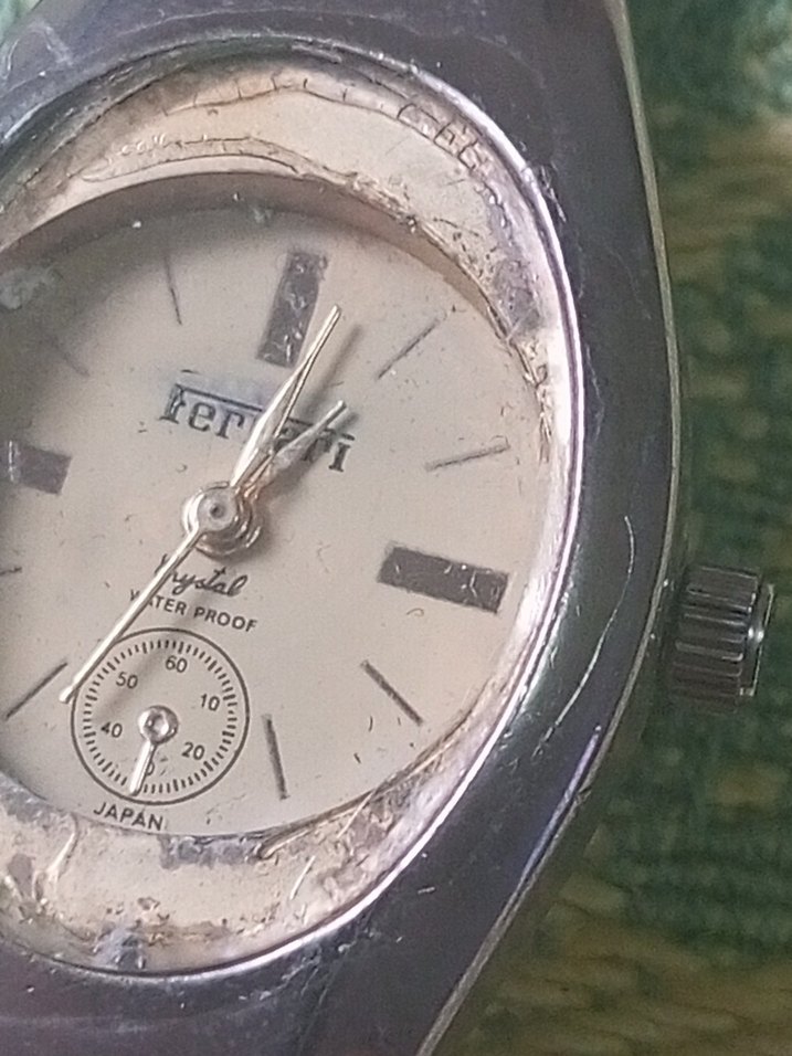 Yeşil tokalı kayışı ve gri kadranı olan vintage kadın kol saati. Kadranda yaşlanma izleri ve "APA, PROO, ter" yazıları bulunur. ⌚