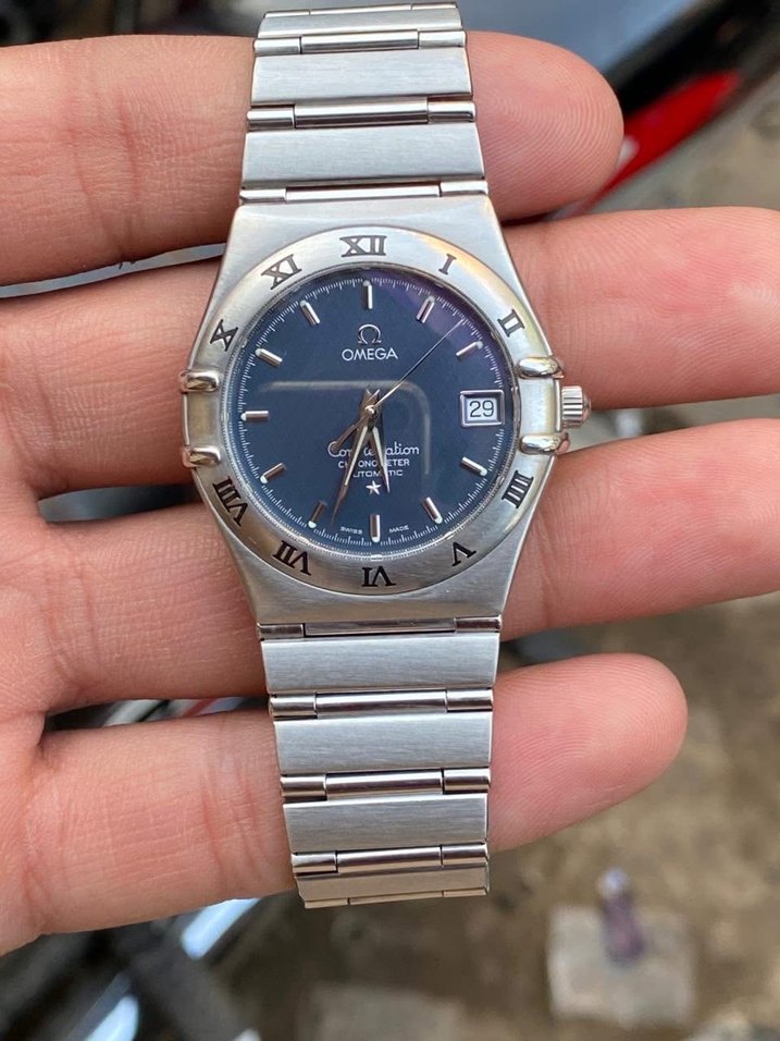 Omega erkek kol saati, lacivert kadran ve gri paslanmaz çelik bilezik ile. Bezelinde Roma rakamları ve 29 tarih göstergesi bulunur. Modern klasik tasarım. ⌚