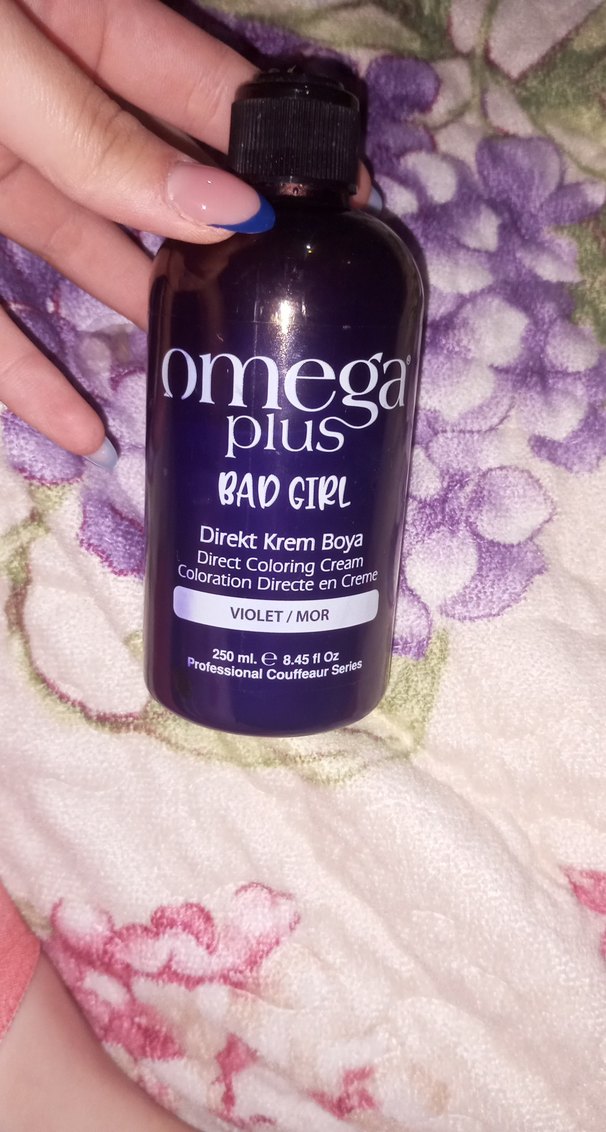 Omega Plus Bad Girl violet tonunda direkt krem saç boyasıdır Ben sadece saçlarımın arkası açıcılıydı oraya bir kere veya iki kere boyamışımdır %80'i dolu pompasının ucu kırık onun harici bir sorunu yok