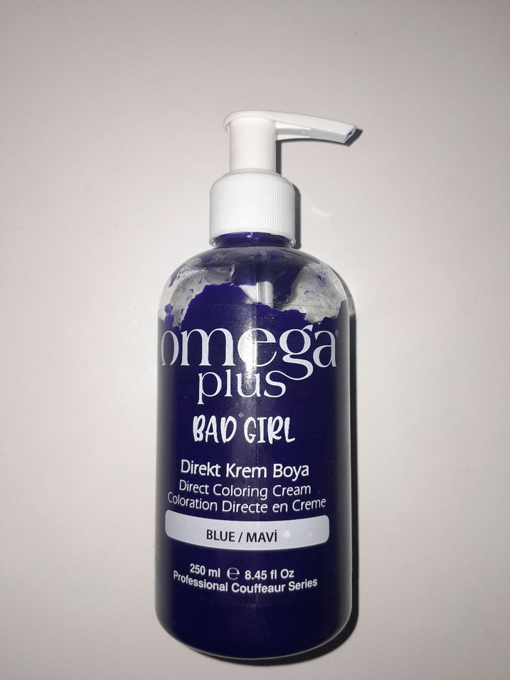 Omega Plus Bad Girl direkt krem boya, mavi renkte 250ml pompalı şişede sunulur. Krem yapısıyla kolay uygulanır.
