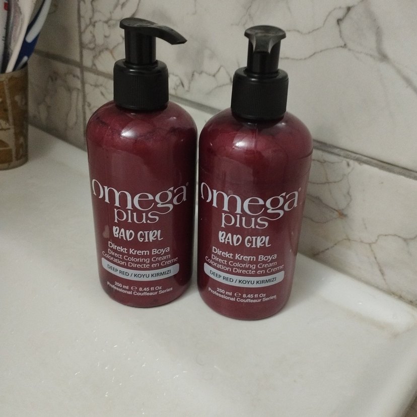 Omega Plus Bad Girl krem boya, koyu kırmızı renkte, 250 ml pompalı şişede sunulur. ♀️ İki şişe fiyatıdır