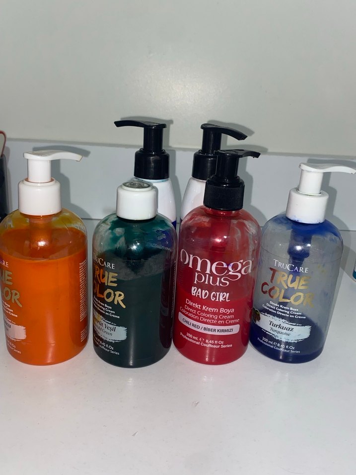 Omega Plus Bad Girl saç boyası seti, turuncu, yeşil, kırmızı ve mavi renklerde pompalı krem formda boyalar içerir. Direkt renk verme özelliğine sahiptir. Sondakilerin içinde az var