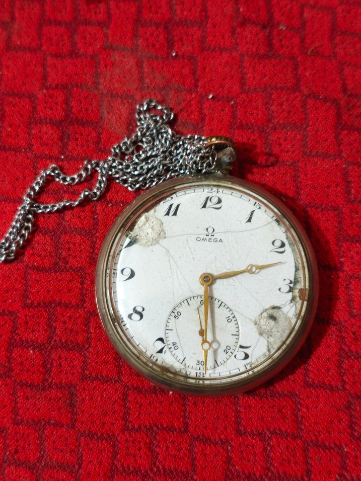 Beyaz kadranlı ve siyah rakamlı Omega vintage cep saati, zincirli. Saatte kullanım izleri ve yaşlanma belirtileri var. ⌚