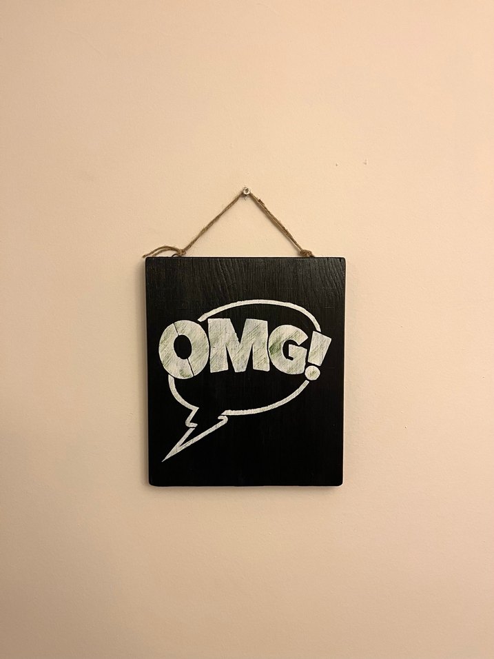 Siyah zemin üzerine beyaz "OMG!" yazılı komik kitap tarzında duvar panosu. ️