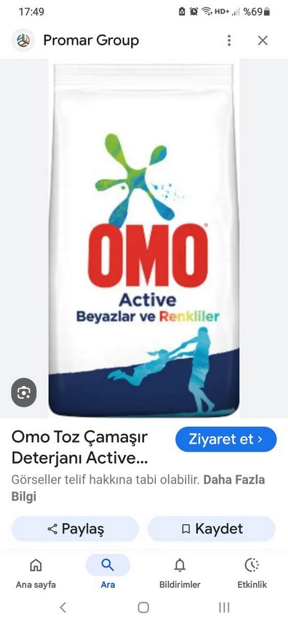 Omo Active toz çamaşır deterjanı, beyazlar ve renkliler için etkili temizlik sağlar. Hafif mavi renkte paketlenmiştir.
