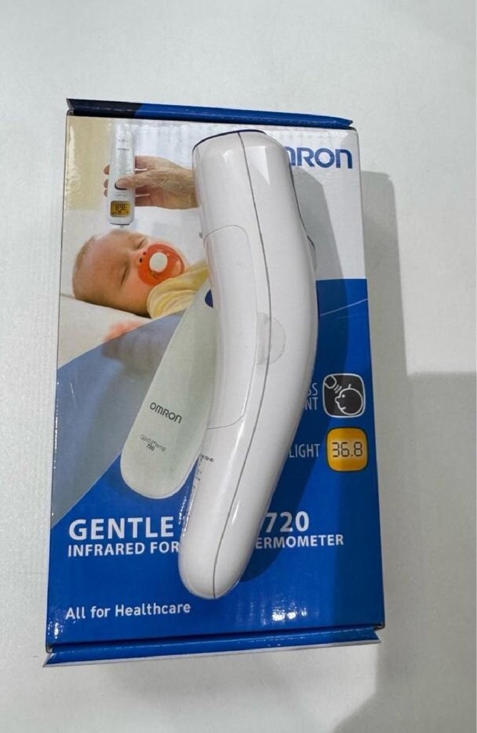 Omron 720 hafif beyaz renkli kızılötesi ateş ölçer, 36.8°C hassas ölçüm sağlar ve sağlık hizmetleri için uygundur.Sıfır kutulu pil etiketi üzerinde