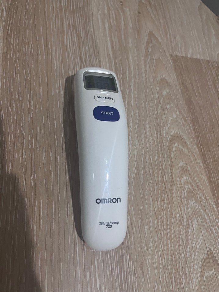 Omron GentlTemp 720 dijital ateş ölçer, kolay kullanımlı start düğmesi ve net ekranıyla sıcaklık ölçümü sağlar. Gri ve beyaz renktedir. ️