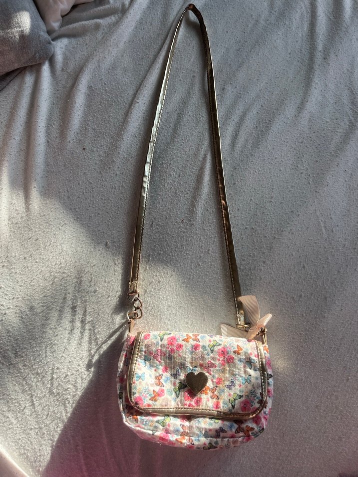 Sentetik kumaştan yapılmış, pastel renkli çiçek desenli çanta