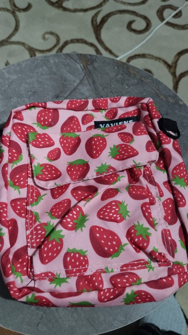 Çilek desenli pembe çapraz çanta, sentetik kumaştan üretilmiştir. Düğmeli ön cep içerir, günlük sokak stiline uygundur.