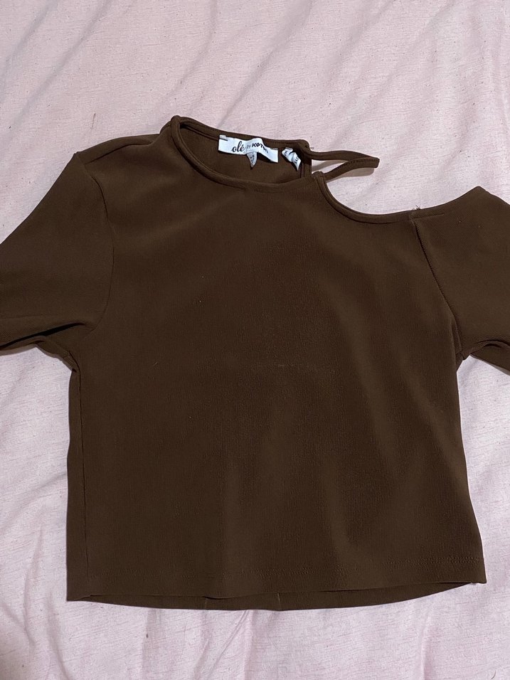 Koyu kahverengi, kısa kollu Sentetik kumaştan olup, şık omuz dekoltesiyle modern bir sokak stili sunar