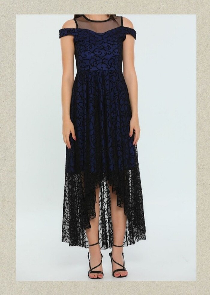 Omuz Detaylı Asimetrik Lacivert Abiye Elbise
