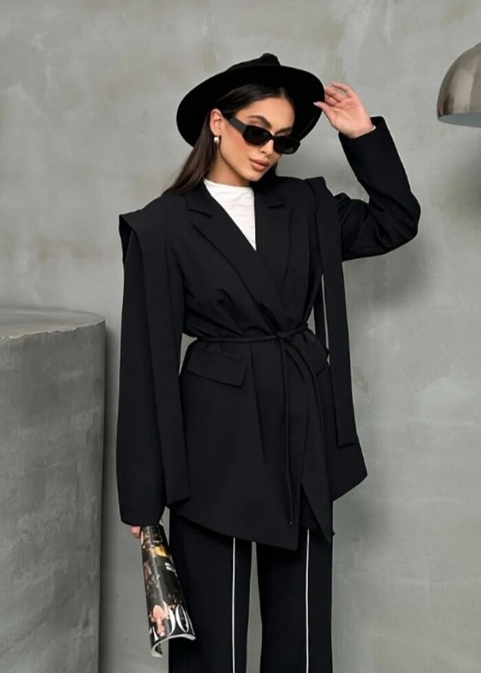 Omuz Detaylı Bağcıklı Siyah Blazer