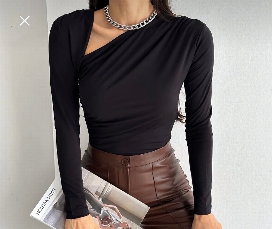 Siyah sandy kumaş tasarıma sahip, uzun kollu ve vücuda oturan modern ofis bluzu. ✨