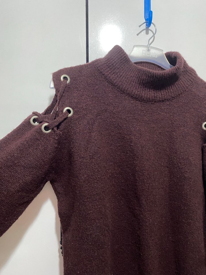 Kahverengi, balıkçı yaka ve uzun kollu, örgü kumaştan yapılmış, omuzlarda bağcıklı detayları olan, normal uzunlukta dar kesim bir kazak.