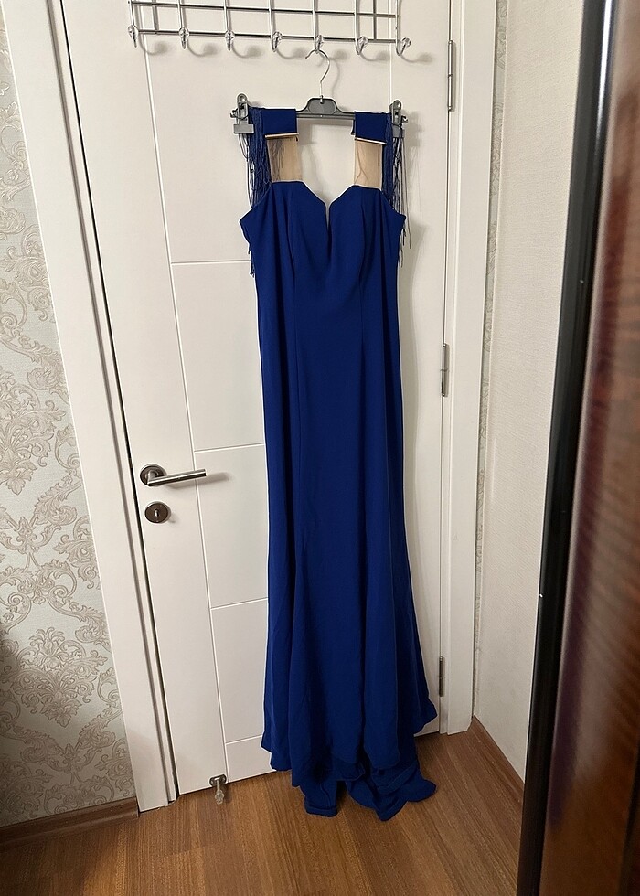 Omuz püsküllü kuyruklu krep kumaş abiye