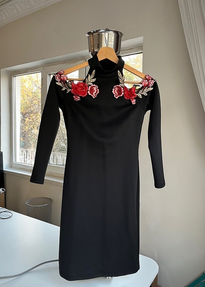 Bir butikten almıştım. Bir kez bile giyilmedi. Etiketi zaten butikteyken kopmuştu ama ipi üstünde duruyor hatta. Omuzları pencereli, çiçek işlemeli elbise.