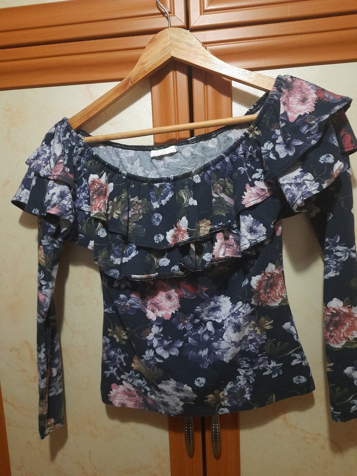Dar kesim, omuzları açık bluz uzun kollu ve yakada fırfır detayına sahiptir. Sentetik kumaştan yapılmış, koyu çiçekli baskılı ve vintage bohem tarzında günlük kullanıma uygundur.