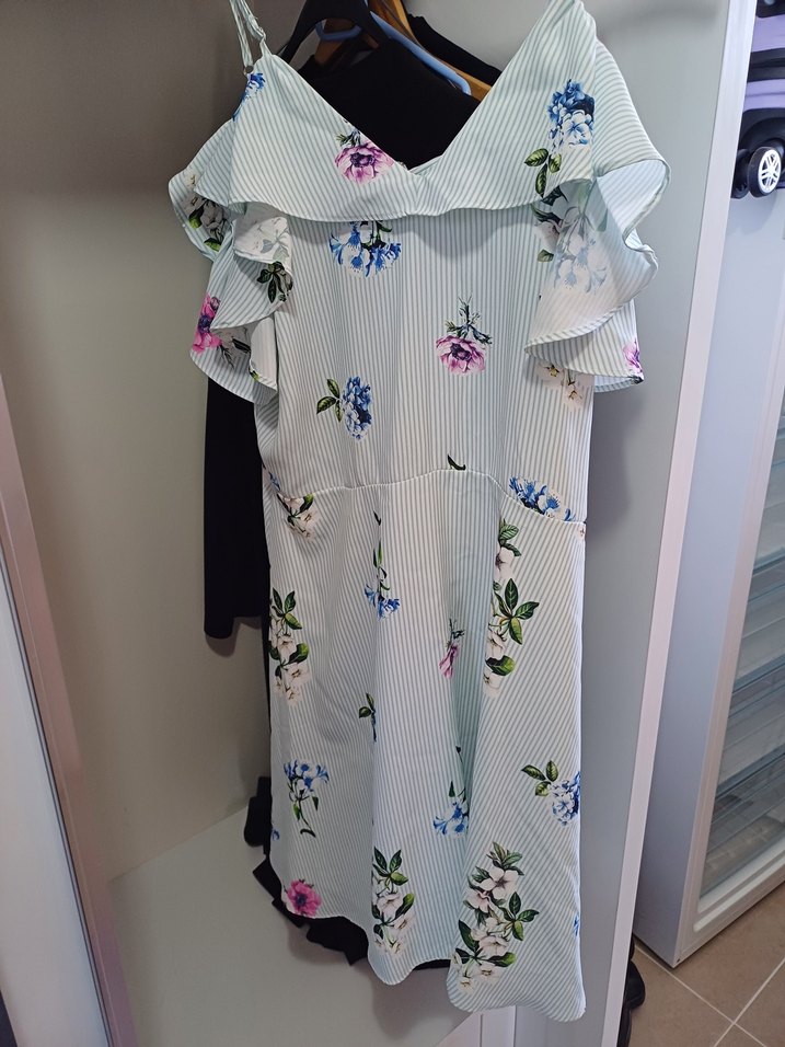 Omuzları açık, kısa kollu elbise, yumuşak sentetik kumaştan üretilmiş ve bol kesimdir. Hafif çiçekli desenleriyle gündelik sokak stiline uygundur.