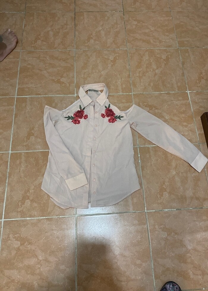Omuzları açık pudra rengi gömlek