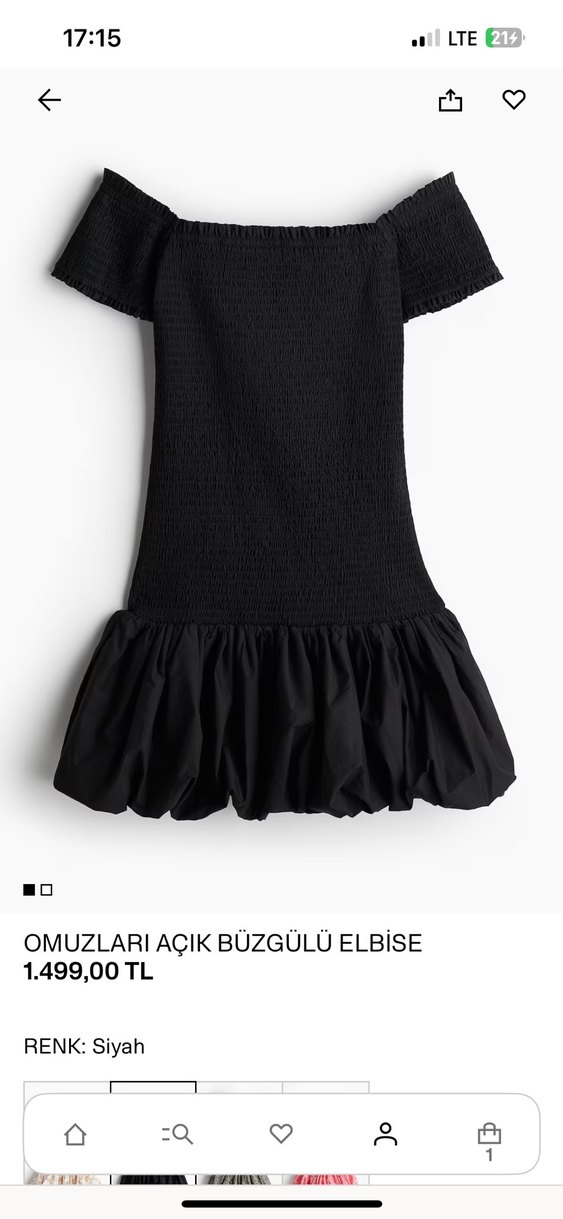 Siyah, büzgülü ve omuzları açık midi elbise, tek renk ve sentetik kumaştan üretilmiştir. Gösterişli ve romantik akşamlar için uygundur.