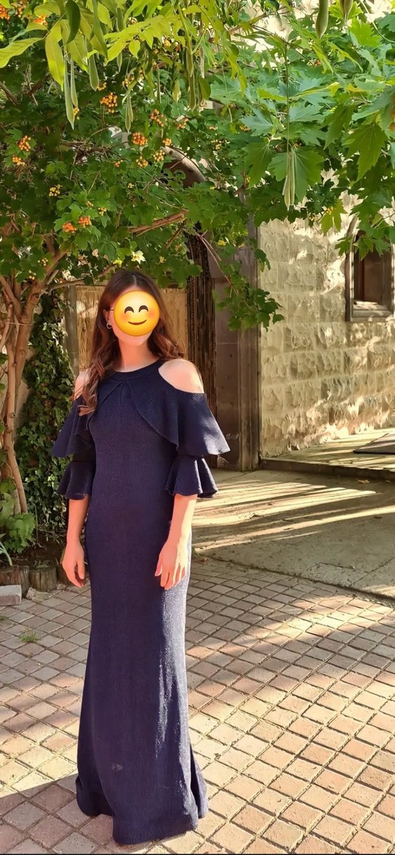 Omzu Açık Yarım Kollu Lacivert Drapeli Elbisesi