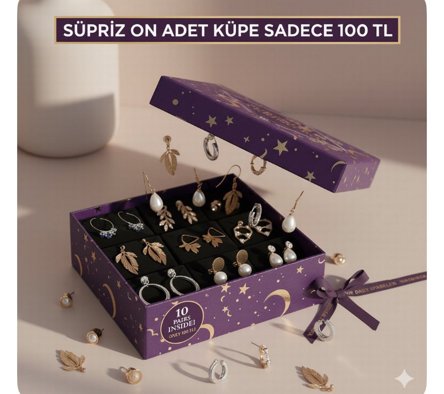 Bu görseli satın alarak sürpriz on çift küpe satın almış olursunuz sadece 100 TL Ödemiş olacaksınız normalde tek tek almak isterseniz 200 TL’ye tekabül eder çift adeti