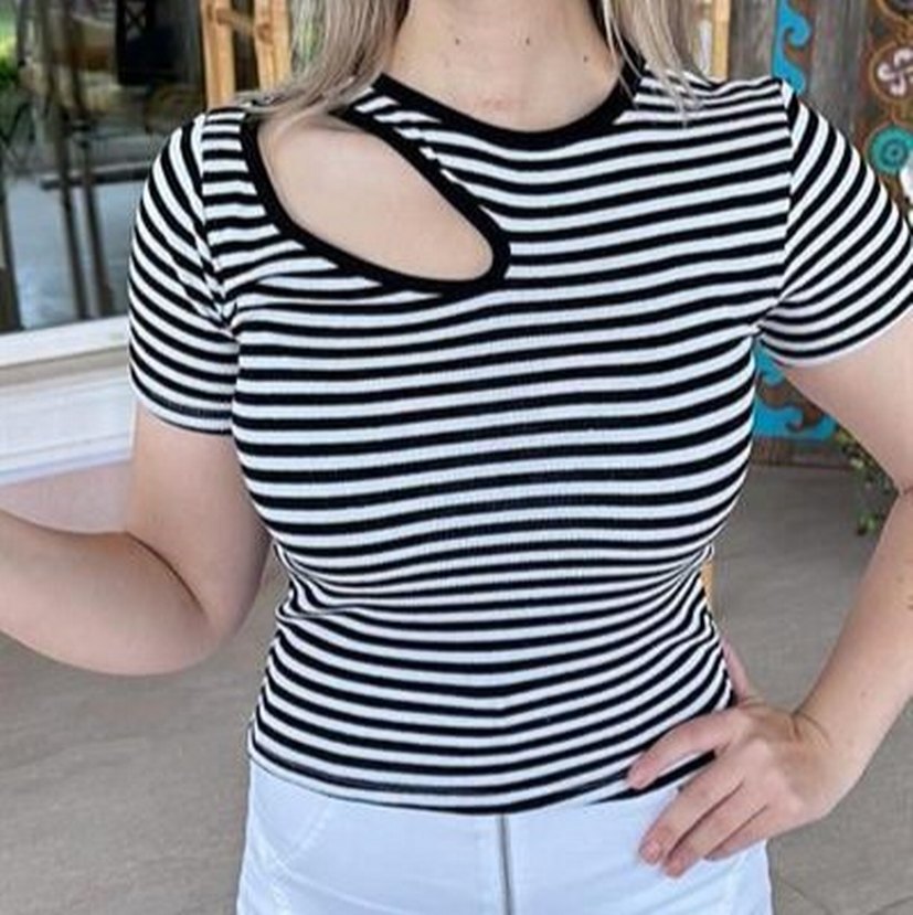 Ön Dekolteli Çizgili Kadın Tişört