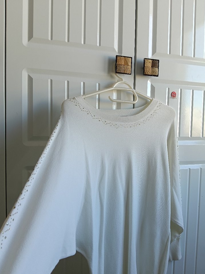 Rengi ekru/kırık beyazdır.Bedeni 2 numaradır,XL'a uyacağını düşünüyorum.Birkaç taşı düşmüş.Yarasa koldur.Tüm detayları fotoğraflarda vardır,fotoğrafları inceleyerek alınız.