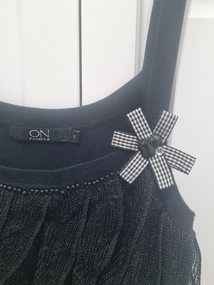 Siyah midi triko buluz, kalin askılı düğme detaylarına sahip. Gevşek kesimi ve sentetik kumaşıyla rahat, gotik tarzda. Ekose çiçek süsüyle farklılık katıyor. Günlük kullanım için uygun.