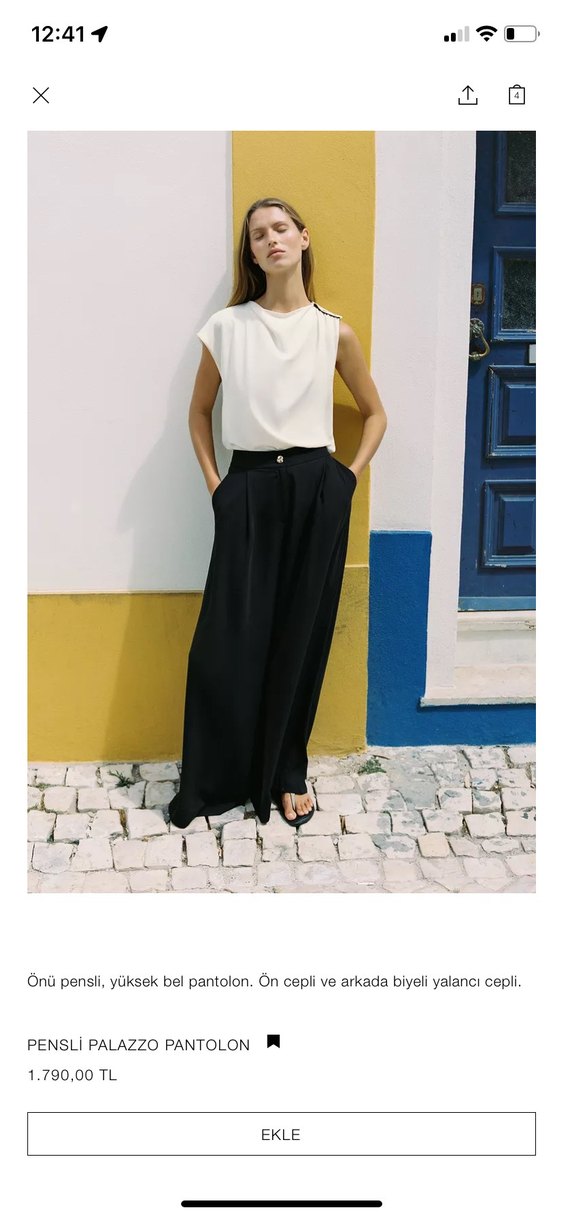 Siyah, ipeksi kumaştan, bol kesim, önü pensli yüksek bel pantolon. Ön cepleri ve arkada biyeli yalancı cepleri bulunur. Ofis için uygun.