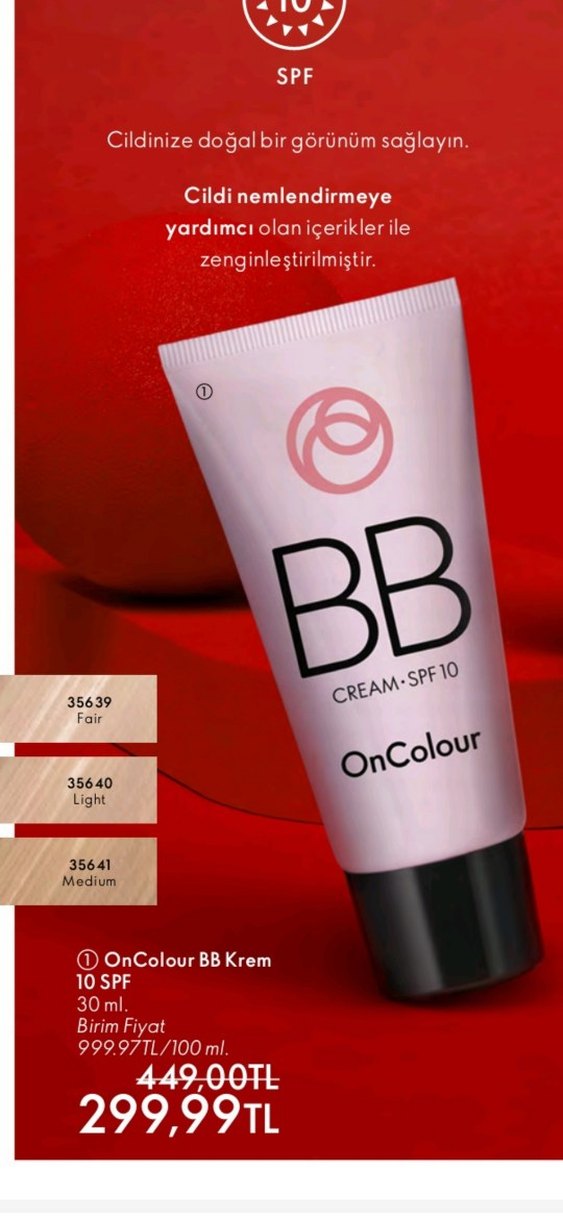 Yardımcı içeriklerle zenginleştirilmiş, SPF 10 korumalı OnColour BB Krem, pembe pastel tüpte, açık, orta ve adil tonlarda sunuluyor.