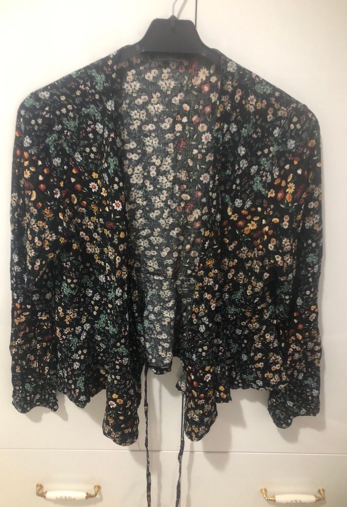 Çok renkli çiçek desenli, midi boy, bol kesim uzun kollu bluz. Yumuşak dokulu kumaştan üretilmiştir.