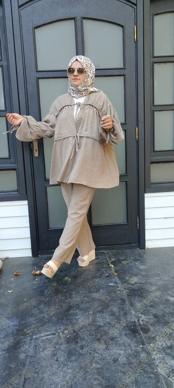 Bej renkli keten kumaştan, kemerli ve uzun kesim, salaş kadın takım elbisesi. Strappy kol ve kesik yaka detaylarıyla sokak stiline uygun, desen içermeyen tasarım.
