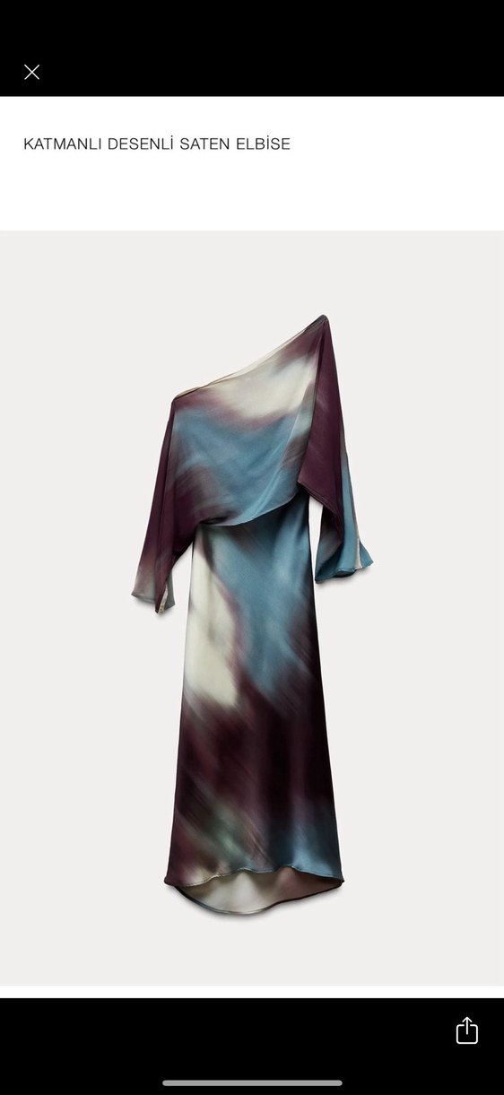 Kadınlar için uzun, bol kesim elbise, önden drapeli tasarım, tek omuz detaylı askılı kollar ve tekne yaka ile. İpek gibi kumaştan, mor ve mavi tonlarında koyu bağlamalı desenli, parti için avant-garde tarzda.